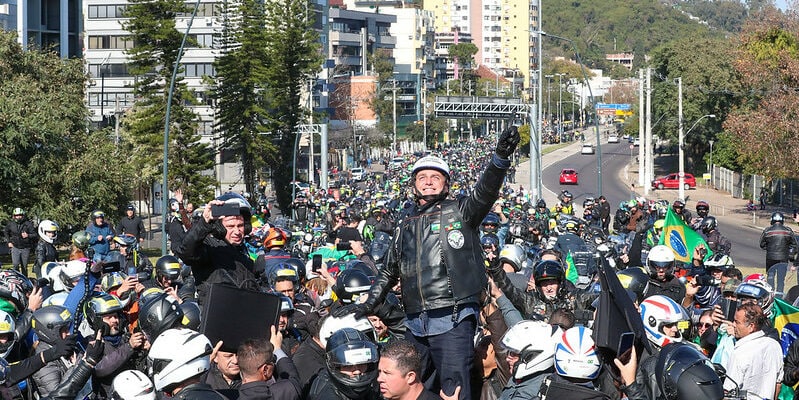 No meio do passeio, Bolsonaro parou sua moto, ficou em pé sobre ela e acenou para os apoiadores. Ele aproveitou que estava em transmissão ao vivo no Facebook e disse que tem um compromisso com a democracia.
