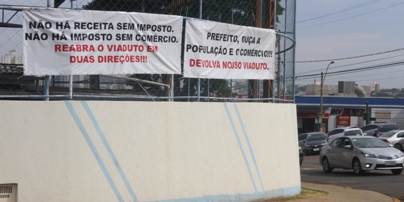 Diversos cartazes reivindicando a volta da mão dupla foram colocados na região. “Não há receita sem imposto. Não há imposto sem comércio. Reabra o viaduto em duas direções”, diz um dos cartazes. A cobrança para que o prefeito retome a forma antiga se arrasta desde o ano passado. “Prefeito, ouça a população e o comércio. Devolva nosso viaduto”, cobraram os empresários.