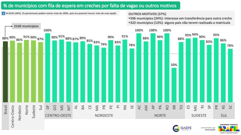 De acordo com o “Levantamento Nacional Retrato da Educação Infantil no Brasil: acesso e disponibilidade de vagas”, apresentado em agosto do ano passado, há cerca de 632 mil registros de crianças em fila de espera para creche, em todo o país. No caso dos municípios, 2.445 deles têm fila de espera nessa etapa.