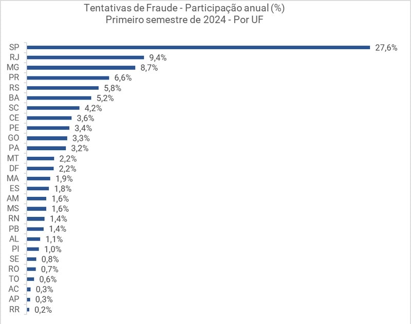 As pessoas que tentam cometer fraudes continuam se concentrando nas regiões Sul e Sudeste. No primeiro semestre deste ano, os estados do Amapá, Acre e Roraima tiveram a menor participação no número de tentativas de fraude. Já os estados de Minas Gerais, Rio de Janeiro e São Paulo têm os maiores percentuais.