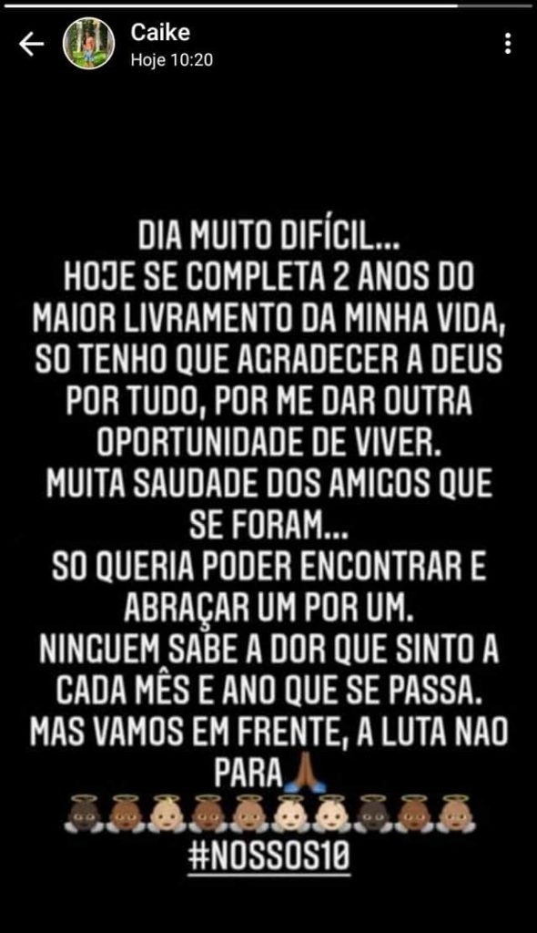 “Dia muito difícil… Hoje se completa 2 anos do maior livramento da minha vida, só tenha que agradecer a Deus por tudo, por me dar outra oportunidade de viver. Muita saudade dos amigos que se foram… Só queria poder encontrar e abraçar um por um. Ninguém sabe a dor que sinto a cada mês e ano que se passa. Mas vamos em frente, a luta não para”, disse o aleta em suas redes sociais.