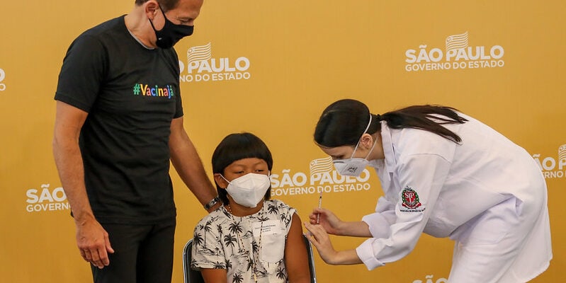 O menino Davi, um indígena xavante de 8 anos que mora em Piracicaba, no interior do estado de São Paulo, é a primeira criança na faixa de 5 a 11 anos de idade a ser vacinada no país. Ele recebeu a dose em uma cerimônia simbólica no início da tarde de hoje (14) no Hospital das Clínicas de São Paulo, com a presença do governador de São Paulo, João Doria.