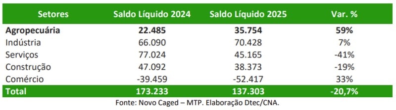 No setor agropecuário, os maiores saldos foram verificados nas regiões Sul e Centro-Oeste, com registros de 17.496 e 16.920, respectivamente. O Sudeste do país registrou 3.191, enquanto o Norte apresentou saldo de 322 empregos. Somente no Nordeste houve perda líquida de empregos no setor.